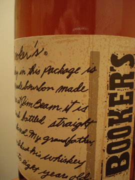 To signify (or justify) the higher price tag and quality, Booker’s comes in a wine bottle. Whether this is due to some naturally more graceful form or merely the association with the beverage of a pricier heritage, I’m not sure. The top of the bottle is encased in black wax, covering a raised and tasseled ‘B’ at the base of the neck – a tasteful effect over all.
