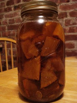 Put the pieces loosely into a mason jar until it’s full. Make sure that it’s not at all tightly packed, leaving about half the volume for the booze, then consult your local pumpkin pie recipe for the proportion of spices (I can’t reveal everything; that wouldn’t be fun) and put your spices into a tied-off teabag, which then goes into the jar. Throw some seeds in there for good measure as well.